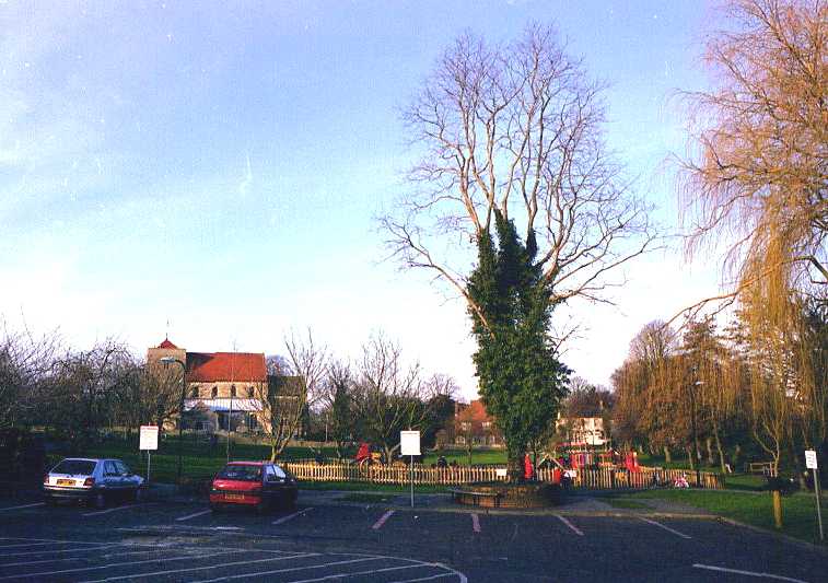| The round black circle opposite the old market square marks the clock tower (at right), which at one point housed the town hall. The car park near the library and the museum is in St. Cuthman's Field, facing St. Andrew's Church (below). |