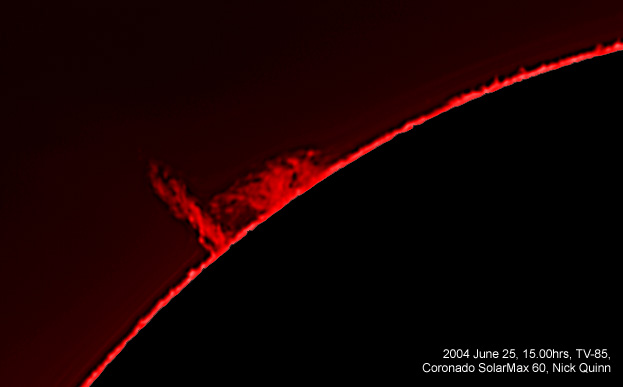 An image of a nice prominence. Image capture using a video camera followed by processing with Registax and Adobe Photoshop.