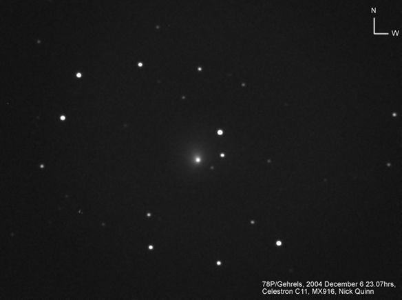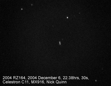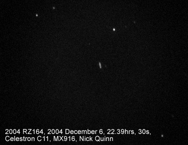 The rapid motion of this minor planet is very evident in these two 30 second integrations. At this time this 'Near Earth' object was 0.0204 AU from Earth, and crossing the sky with an apparent angular velocity of 40 arcminutes per hour (the apparent diameter of the Moon is about 30 arcminutes). Here is a video (in Real format) made up of 40, 5 second integrations, taken on 2004 December 6 between 22.42 hrs and 22.47 hrs.